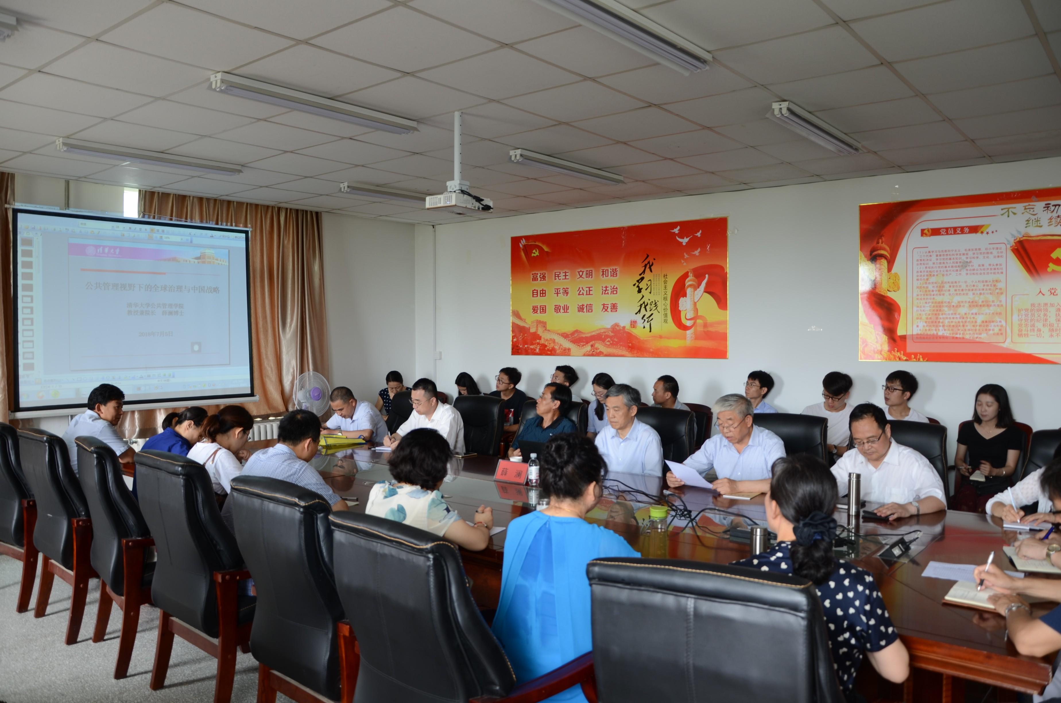 2018年7月5日上午,应我学院和MPA教育中心邀请,清华大学文科资深教授、博士生导师、公共管理学院院长,国务院公共管理学科评议组召集人、中国行政管理学会副会长、全国MPA教育指导委员会副主任委员薛澜教授为学院师生做了题为“公共管理视野下的全球治理与中国战略”的学术报告。报告会由丁金光院长主持,政管学院各系、MPA教育中心师生60余人参加了报告会。