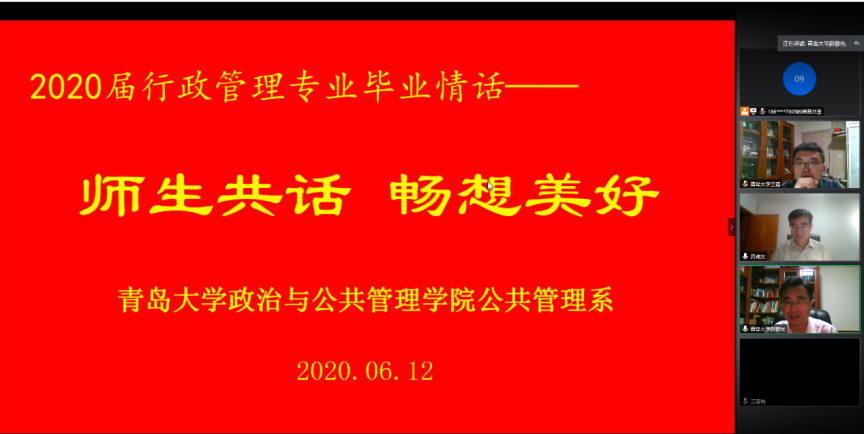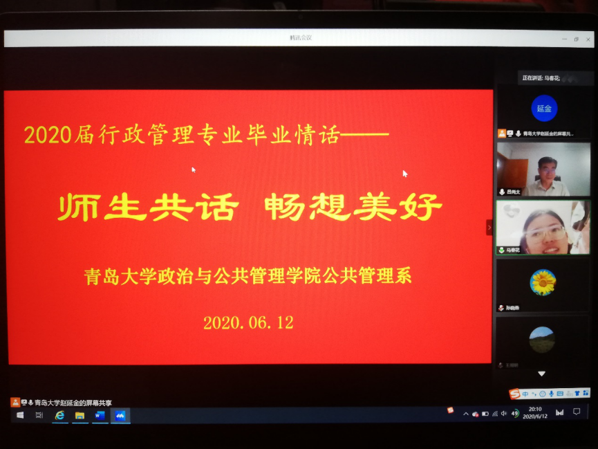 公共管理系“2020届行政管理专业毕业情话——师生共话,畅想美好”活动通过网络视频会议的形式把全体教师和学生再一次联通了起来,大家纷纷通过视频共话师生情、同学情,畅想幸福未来,传递美好祝愿。