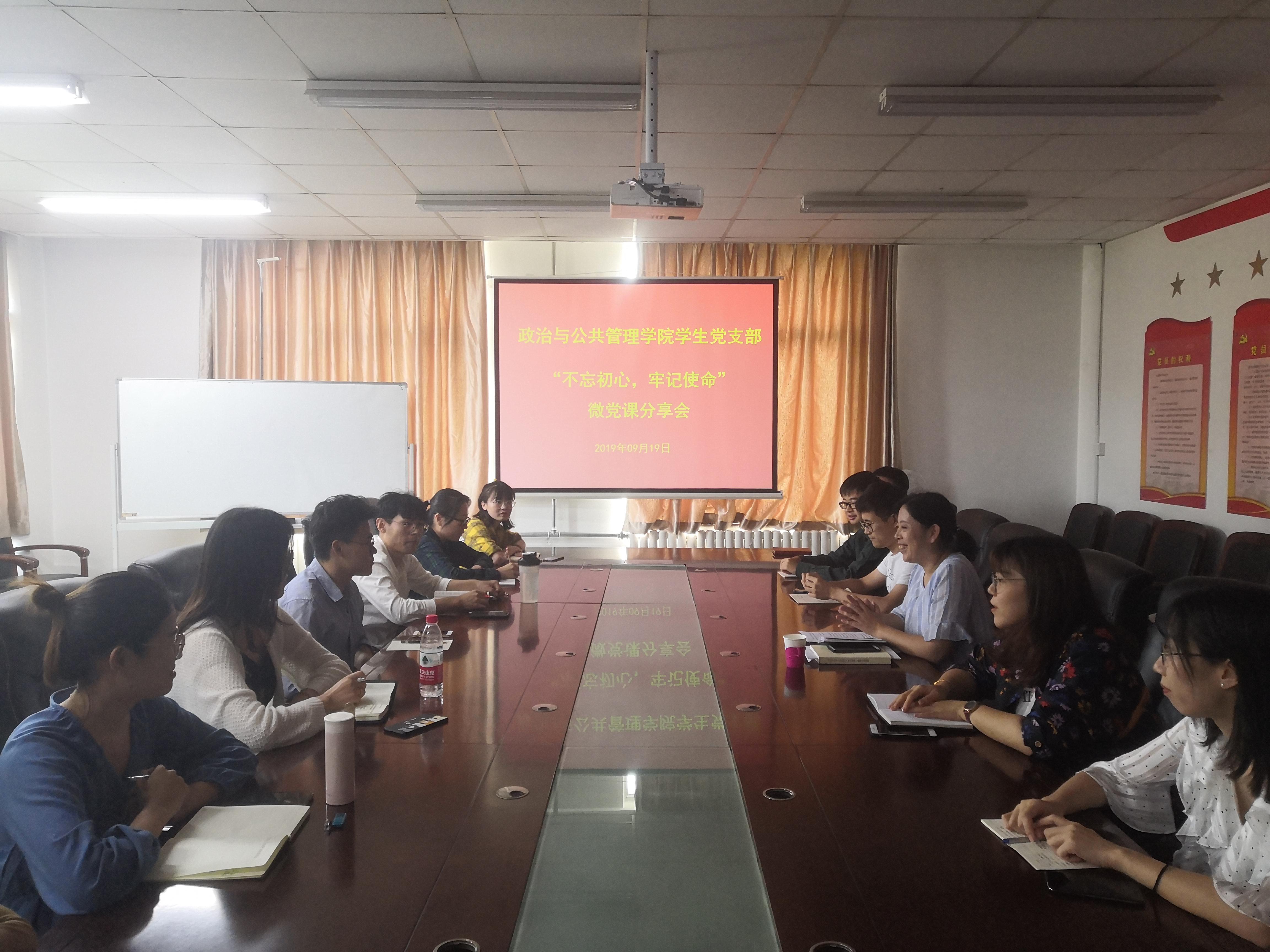 2019年9月19日13时,学院学生党支部在2号实验楼214举行“不忘初心、牢记使命”主题教育微党课分享会。会议由学院党委副书记隋晓玲主持,学院全体在校学生党员参加会议。