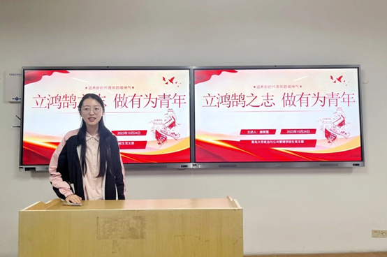 学生党支部在金家岭校区一号教学楼408室举行“立鸿鹄之志,做有为青年”主题宣讲。由“雁阵行”宣讲团成员康荣雪主讲,2023年秋季学期全体党员发展对象和入积极分子参加本次宣讲活动党。