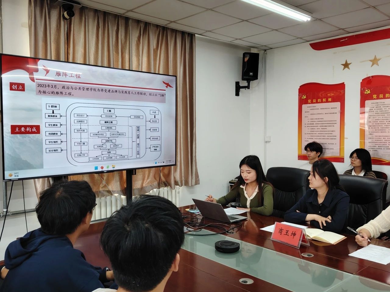 学生党支部副书记张晴详细介绍了学生党支部的特色党建品牌“雁阵工程”的党建主体、协同育人机制、构建组织群体联动模式等内容,并呼吁同学们积极参与“鸿雁示范”党日活动、群雁共进”专题党课、“雁阵成行”实践活动、“雁阵齐飞”帮扶活动等四类特色活动。同时,她介绍了本次培训课的课程内容,并对所有学员提出了三点要求:一是要根据课程安排,按时高质量完成学习,认真听讲;二是根据学习要求,按时完成学习任务,做好笔记;三是积极参与党支部的各项活动,为支部的发展建言献策。