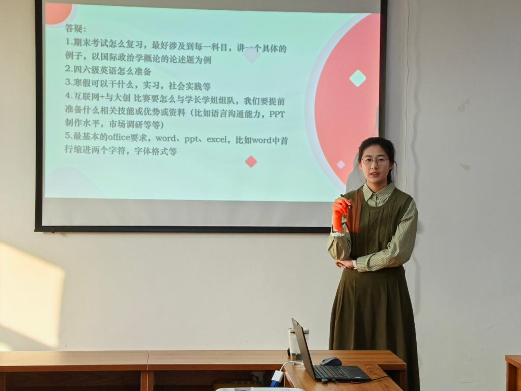 随后,2022级国际政治班于江然从专业课学习、学业考试、日常时间安排三个角度向同学们讲解学习方面的相关内容。她建议同学们有选择性地参加技能考试,并强调英语四六级考试的重要性。同时,她通过分享自己出国访学的经历,鼓励同学们勇于探索,找到自己所爱。