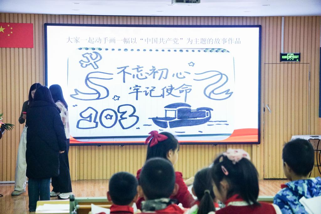 不忘初心跟党走,砥砺前行向未来。学生党支部成员陈景蓉以时间为线索,讲述了中国共产党成立的时代背景和思想基础,阐释了党在奋斗历程中形成的“红船精神”的深刻内涵。随后,陈景蓉以播放红色动画短片《跟着那兔学党史:开会!建党!》《那年那兔那些事:新的征程》的形式向小学生们普及了党史知识,并组织了互动问答。她鼓励同学们牢记历史,继承和发扬“红船精神”,勇于面对未来的挑战,刻苦学习,增长才干,为祖国的建设贡献自己的力量。