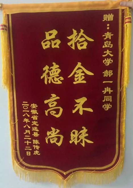 党政管理办公室收到了一个包裹。打开包裹,首先映入眼帘的是一面写着“拾金不昧,品德高尚”的锦旗。还有一张红色的表扬信。原来,是一位丢了手提包又失而复得的失主想要感谢这位青大学生的善举。这名拾金不昧的学生就是中国AV