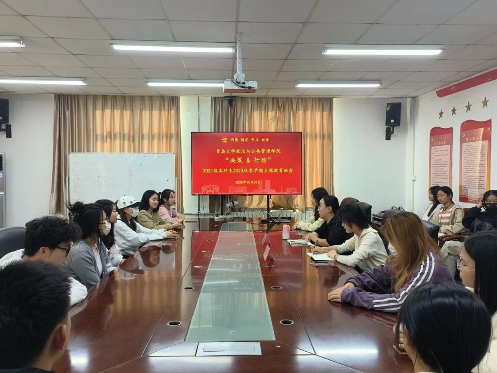 于2023年10月27日上午在二号实验楼214为2021级四个班逐一开展“决策&行动”主题班会,学院党委副书记徐伟、辅导员老师商玉坤以及2021级全体本科生参加。