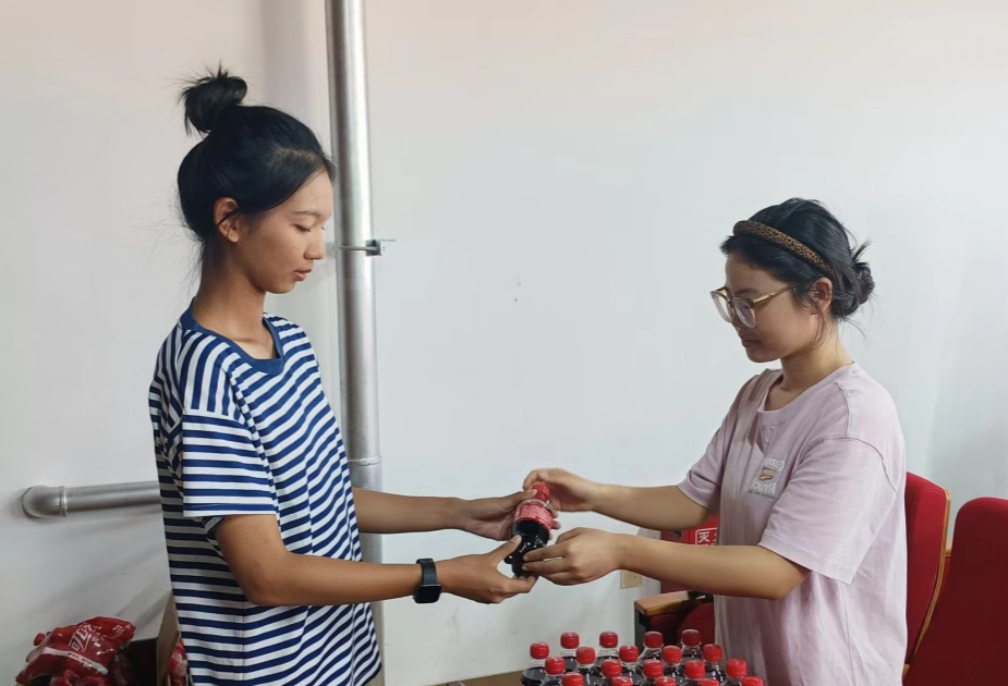 会议召开前,张伟为新生送上提前准备好的可口可乐,庆祝2024级军训的圆满结束,并期待他们在未来的生活和学习中积极向上、朝气蓬勃。