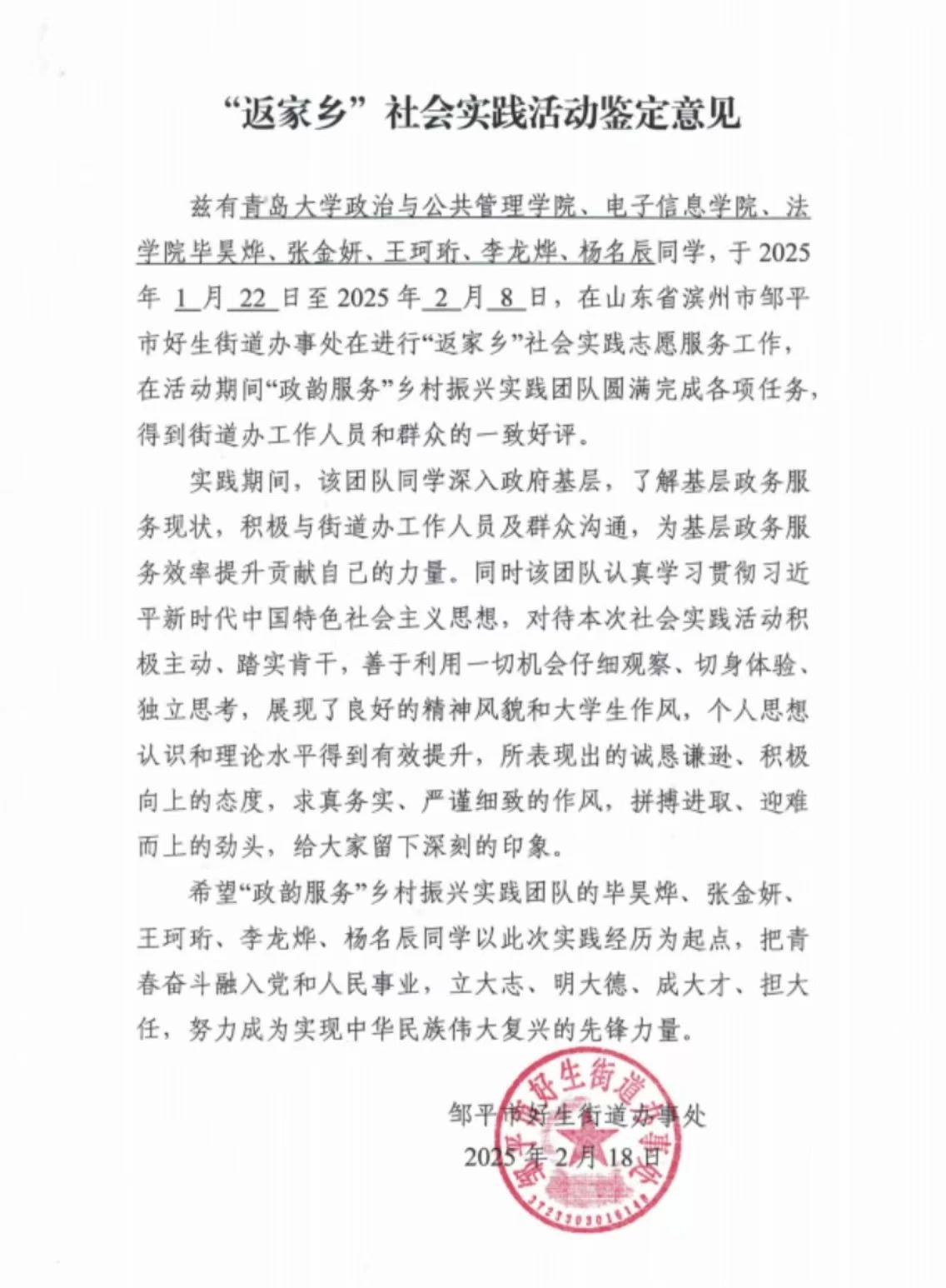 、物理科学学院、化学化工学院学生组成的少年“政”有为乡村振兴调研实践团,于2025年寒假深入山东省莱西市产芝村进行了为期10天的实地调研,全面认识了习近平总书记扎实推进乡村全面振兴的思想,深刻领悟了地方特色资源与乡村农家乐相结合对于促进乡村振兴发展的重要意义,采用了问卷调查、无结构访谈、半结构访谈、观察调查等社会科学研究方法,收获满满。(主要负责人:曲芸 团队成员:高圣淇,李欣茹,曹童禄)