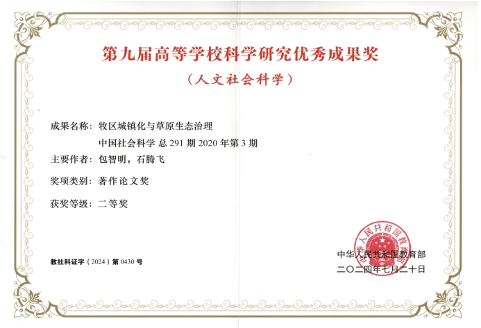 教师石腾飞副教授以第二作者身份在《中国社会科学》2020年第3期发表的研究成果《牧区城镇化与草原生态治理》获得第九届高等学校科学研究优秀成果奖(人文社会科学)著作论文类二等奖(第2位次),实现了中国AV