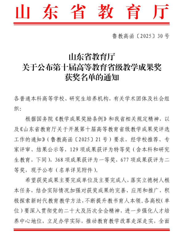 近日,山东省教育厅下发《山东省教育厅关于公布第十届高等教育省级教学成果奖获奖名单的通知》(鲁教高函〔2025〕30号),中国AV