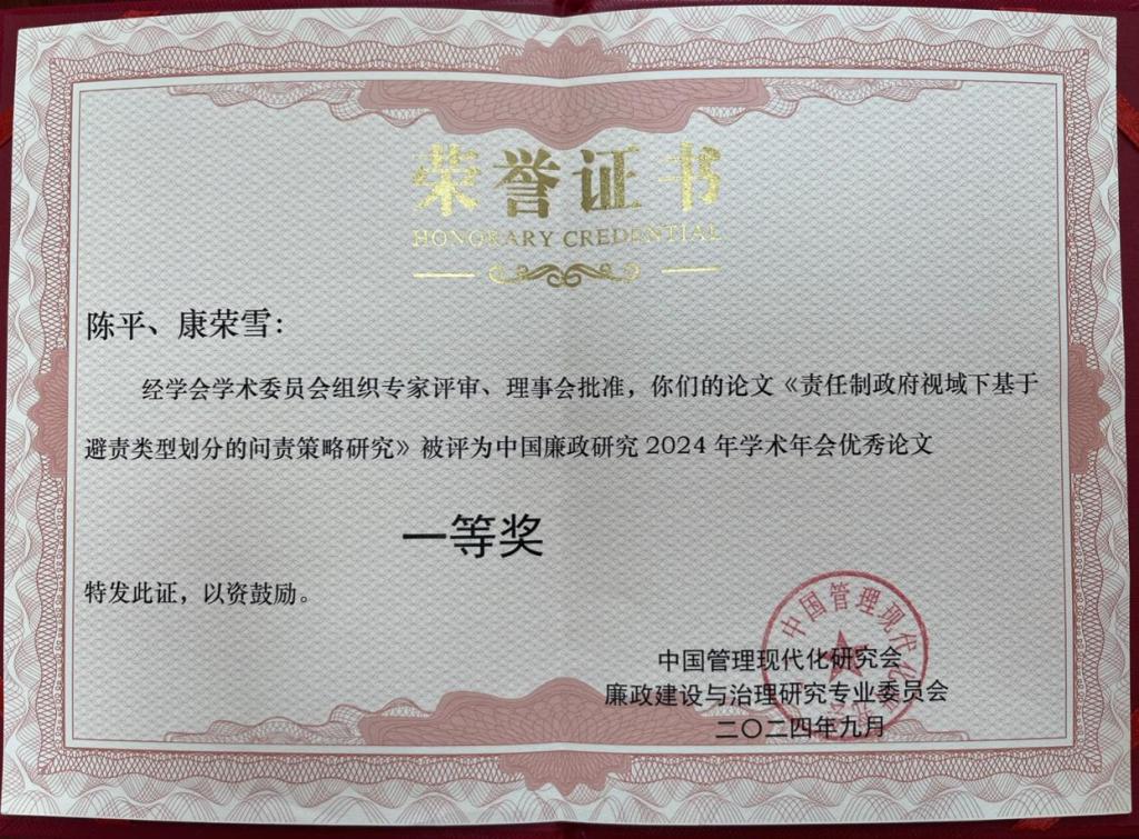 提交的五篇论文被《中国廉政研究2024年学术年会暨“清风荷韵·中原廉文化”系列活动交流资料》收录,分别是姚芊芊、陈洪连撰写的《乡村振兴背景下农村“微腐败”的生成逻辑与治理策略——基子“权力一动机一技术”的分析视角》,陈平、康荣雪撰写的《责任制政府视域下基于避责类型划分的问责策略研究》,任琴、修相科撰写的《巡视巡察制度优势转化为廉政治理效能的逻辑理路、内在机理及实现路径》,陈平、董纯燕撰写的《SOR 视角下基层新型隐性腐败的发生机理及治理对策研究》和贾浩霖撰写的《阶段划分、制度变迁与动力机制:德国反腐制度历史演进》。其中,陈平、康荣雪撰写的论文被评为中国廉政研究2023年学术年会优秀论文一等奖。中国AV