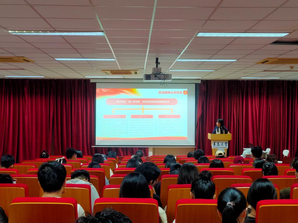 学生党支部于金家岭校区图文中心三楼报告厅举办“肩负重任,挺膺担当,争做时代好青年”主题宣讲。“雁政行”宣讲团成员荣靓赛担任主讲,学院全体2023年秋季学期党员发展对象、入党积极分子和主要团学骨干参加本次宣讲活动。