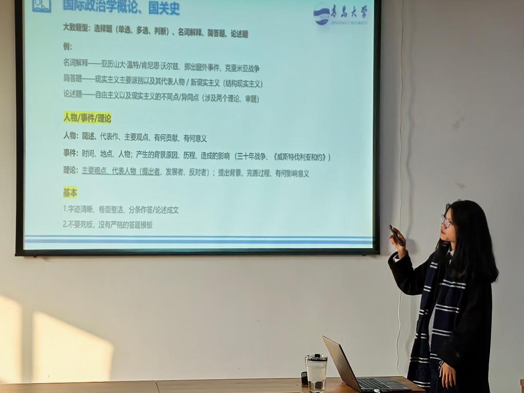 首先,2021级国际政治班徐嘉欣以山东拔尖选调为例,对拔尖选调政策进行细致的分析,并结合自身经历介绍拔尖选调生的选拔条件和选拔流程。随后,她强调公务员考试笔试准备的重要性,并通过展示考试真题让同学们对题型有所了解。此外,针对同学们有关专业比赛的疑问,徐嘉欣分享了自己的心得经验,并鼓励大家积极准备、勇于尝试。