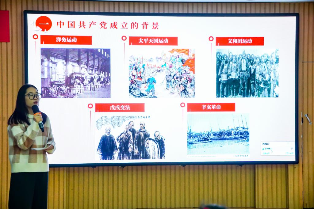 不忘初心跟党走,砥砺前行向未来。学生党支部成员陈景蓉以时间为线索,讲述了中国共产党成立的时代背景和思想基础,阐释了党在奋斗历程中形成的“红船精神”的深刻内涵。随后,陈景蓉以播放红色动画短片《跟着那兔学党史:开会!建党!》《那年那兔那些事:新的征程》的形式向小学生们普及了党史知识,并组织了互动问答。她鼓励同学们牢记历史,继承和发扬“红船精神”,勇于面对未来的挑战,刻苦学习,增长才干,为祖国的建设贡献自己的力量。