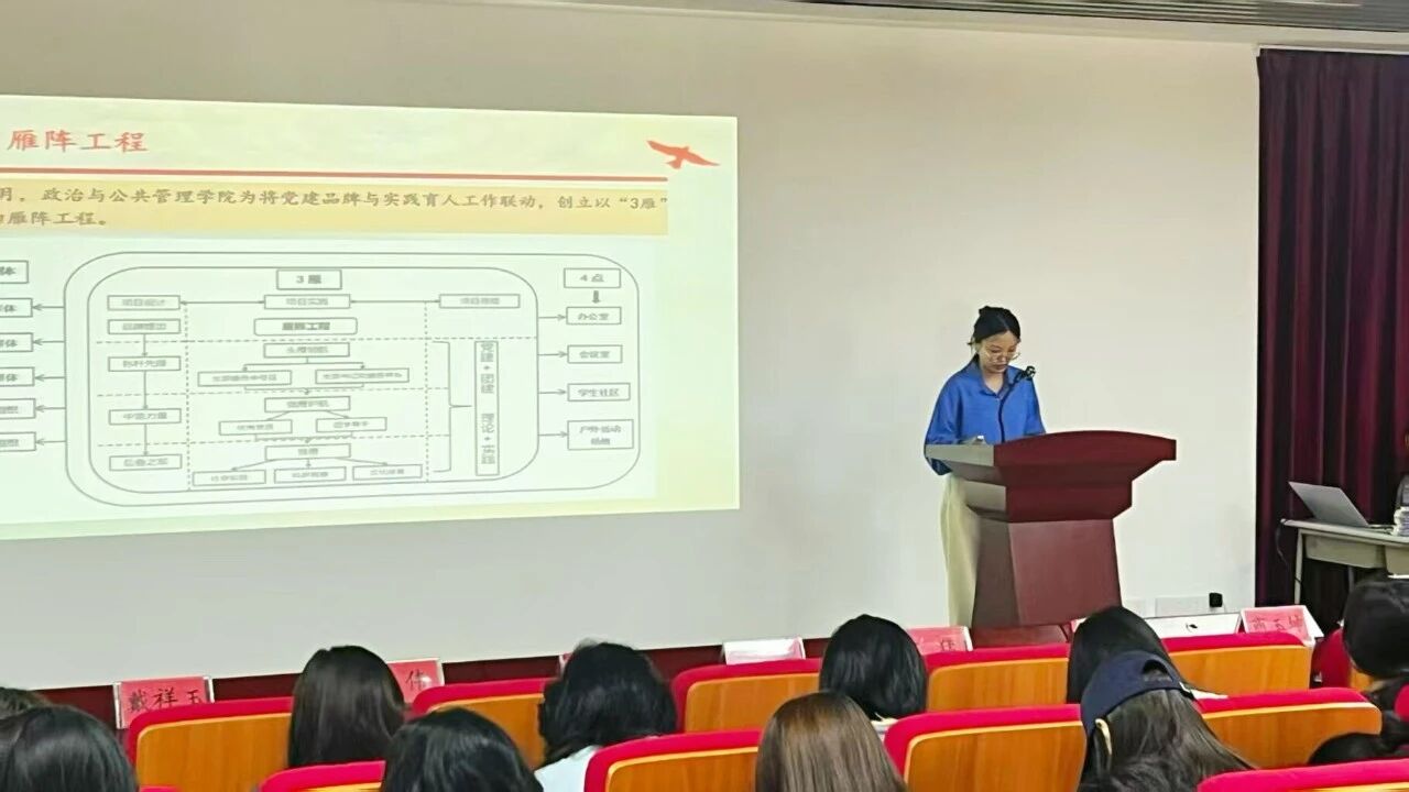 杨翔宇为新生系统介绍了学院学生党支部“雁阵工程”特色党建品牌。她聚焦“三雁四点五群体”,围绕“鸿雁示范”专题党课、“群雁共进”党日活动、“雁阵成行”实践活动、“雁阵齐飞”帮扶活动四个活动阵地,详细解读了品牌的基本情况与组织架构。
