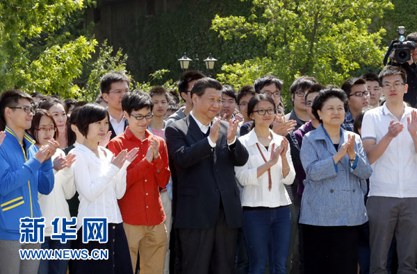 5月4日,中共中央总书记、国家主席、中央军委主席习近平在北京大学考察。这是习近平在校园观看北大师生纪念五四运动95周年青春诗会。新华社记者鞠鹏摄