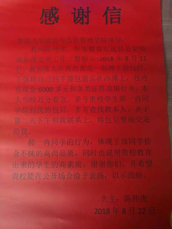 党政管理办公室收到了一个包裹。打开包裹,首先映入眼帘的是一面写着“拾金不昧,品德高尚”的锦旗。还有一张红色的表扬信。原来,是一位丢了手提包又失而复得的失主想要感谢这位青大学生的善举。这名拾金不昧的学生就是中国AV