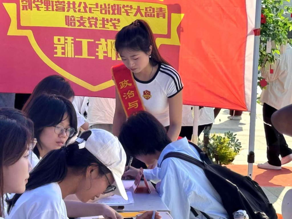 在图文中心的本科生报到点及二号实验楼的研究生报到点前,学生会、研究生会及新生代班、志愿者正为小萌新们办理登记报到手续,确保每一位“新伙伴”都能顺利加入政管大家庭。