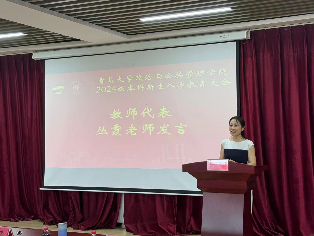 教师代表丛霞告诉大家,大学是学习知识、自我探索、成长蜕变的舞台,新生应当以目标为导向,努力培养自律习惯和批判性思维,善于思考、勇于创新,在尝试和探索中提高认知、拓宽视野。同时,她叮嘱同学们在学会独立担当的同时,珍惜同窗情谊,相互支持、共同成长。