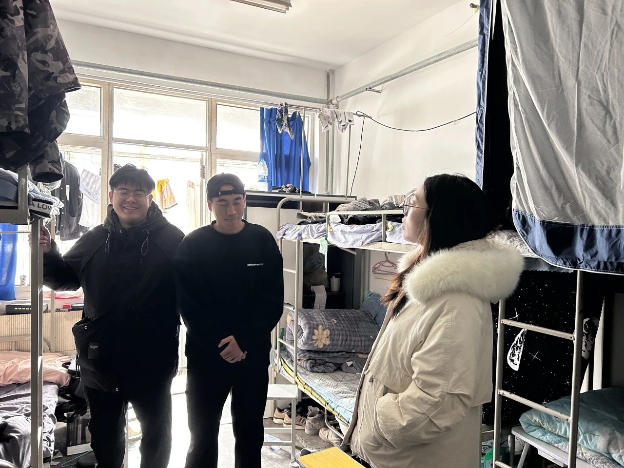 辅导员老师张伟、王嘉伟、商玉坤走访学生宿舍,重点检查消防设施与用电安全。老师们详细询问同学们返校后的生活学习状况,提醒学生做好开学季传染病预防工作,强调“人走断电”、“宿舍禁烟”等安全事项。