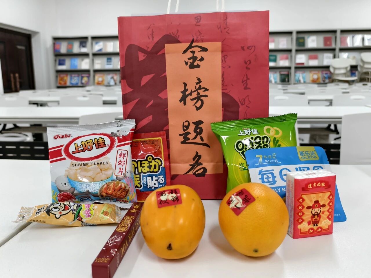 这份祝福凝结于一个个精心筹备的福袋之中:精选的坚果为学子们补充能量;饱满的柿子与橙子,贴着励志的贴纸,愿大家“心想柿橙”;暖宝宝代表温暖常伴;旺仔棒棒糖寓意好运连连;“金榜题名”的定制纸巾以及“前途似锦”盲盒笔,寄托了对同学们考试顺利、鹏程万里的美好祝愿。一份份别出心裁的礼物,承载着学院最诚挚的期盼。