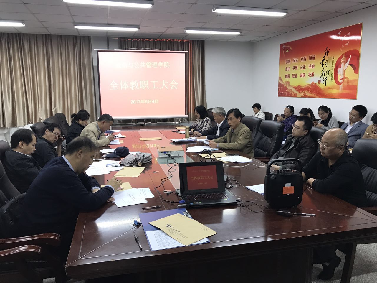 在金家岭校区2号实验楼214多功能活动室召开全体教职工大会,学院党委副书记、工会主席隋晓玲主持会议。