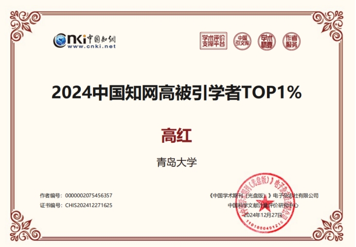 教师高红教授获评“2024年度知网高被引学者TOP1%”。