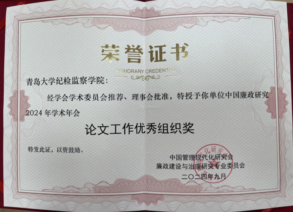 纪检监察学院被授予中国廉政研究2024年学术会议论文工作优秀组织奖。